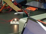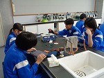 「塩化銅水溶液に電気を流すとどんな変化が起こるか」というテーマで学習に取り組む生徒たち。実験を通して、「実験の最中、プールのにおいがした」「赤色の物質がついた」・・・など、見たこと感じたことをしっかり表現していました。グループみんなで協力し、1つ1つていねいに活動する姿もいいですね!