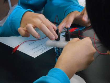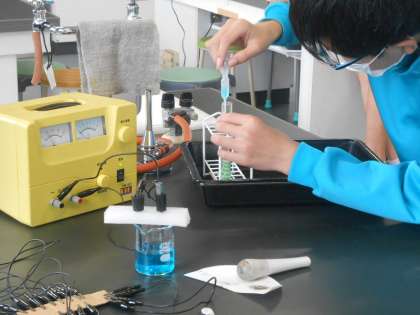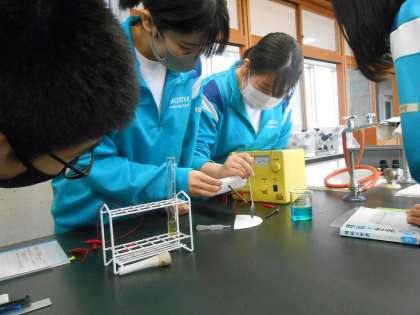 3年理科 電解質の水溶液中に電流を流したときの化学反応2 公開日 2021/10/07 更新日 2021/10/07 生徒たちの活動 塩化銅水溶液に電流を流し化学反応によって銅と塩素に電気分解し、塩素を赤いインク水に入れる実験を行いました。その結果を観察シートに記録しました。