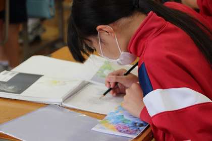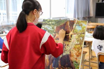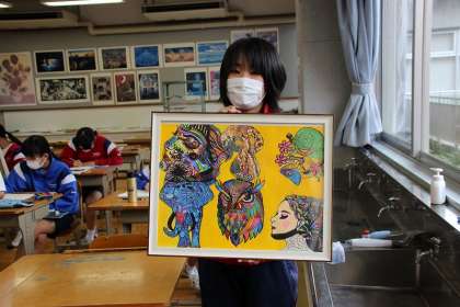 美術部 土曜日の部活 公開日 2021/10/09 更新日 2021/10/09 生徒たちの活動 美術部の生徒がゼンタングルという連続模様の技法で描いた、アンデス文化を思わせる一枚の絵を、校長室へと見せてくれました。 他の生徒もとても熱心に作品制作に取り組んでいました。