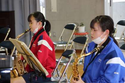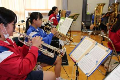 吹奏楽部 土曜日の部活 公開日 2021/10/09 更新日 2021/10/09 生徒たちの活動 「楽譜をしっかりみよう」「楽譜はそのようになっているのかな」。一人ずつ課題を与えられ、自主練を行い、最後にみんなで合わせる。吹奏楽部の練習も他の部活同様、基本を大切にして練習を行っています。