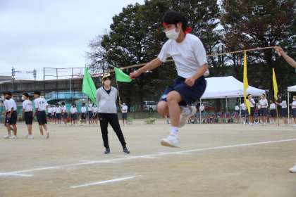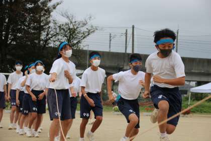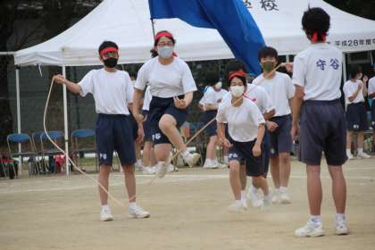 4つの団が制限時間の中で、連続八の字跳びの回数を競います。