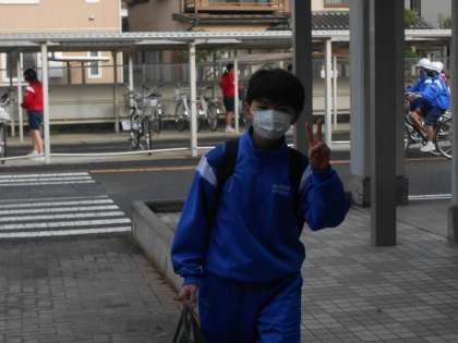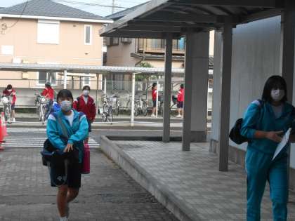 歩行通路が狭くなっています。生徒達は敷地内の横断歩道の付近で自転車を降りて駐輪します。