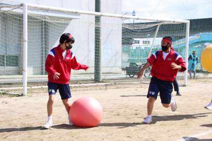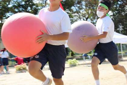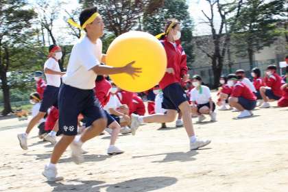 大きなカラーボールを抱えて走るという、実に単純にみえるレースですが、生徒達が一生懸命に走る姿をみると、逆におもしろさが増大し、エキサイトなレースになっていきます。