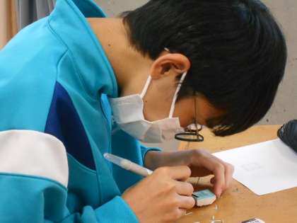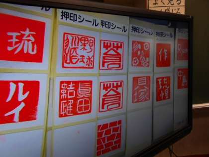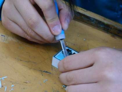 ていねいに彫刻刀を使って、自分だけの篆刻を彫っています。