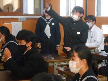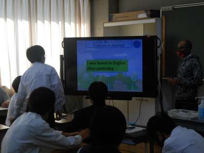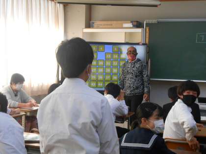 教室では、授業の後半に英語クイズで盛り上がっていました。生徒がクイズナンバーを伝えると、ALTのタイ先生が作ったピクチャーカードとその説明の英文が提示されます。その内容に関する英語での質問に答えます。チーム対戦だけに盛り上がります。