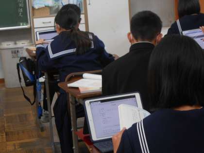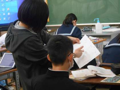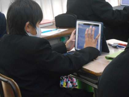 似ている言葉を探し、その違いを明確に相手に伝えるため、端末で言葉探しをして、発表材料を探す一人活動の時間です。