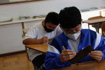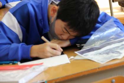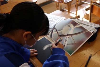 黒い塩ビシートにスクラッチで動物や鳥などを描きます。対象物の輪郭線は描かずに、すべてスクラッチによって形を浮き彫りにしていく技法です。