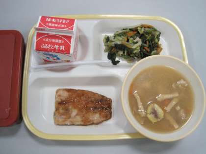 11月22日の給食は「ごはん、牛乳、さんまのかば焼き、冬野菜のおかかあえ、吹き寄せ汁」です。今週から「茨城をたべよう献立WEEK」が始まります。今日の吹き寄せ汁には茨城県産の栗が入っています。