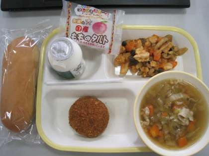 今日の給食 公開日 2022/02/08 更新日 2022/02/08 お知らせ 2月8日の献立は「ミルクパン、飲むヨーグルト、カレーコロッケ、鶏肉のトマト煮込み、冬野菜のスープ、桃タルト」です。スープには冬野菜の甘みがたっぷり出ていました。