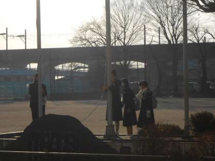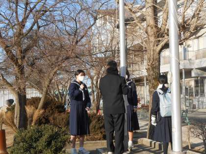 明日は大雪の心配があると天気予報が伝えていましたが、今朝の天気は真っ青な空が広がる良い天気です。今朝も朝靄の中、生徒達がいつものように掲揚台で旗揚げをしてくれていました。