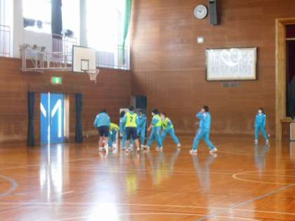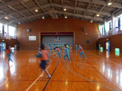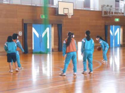 女子は、体育館でバスケットボールです。チームごとに目標を立て、作戦を考えていました。試合では、どのチームもドリブル、パス、シュートとチームワークを発揮していました。