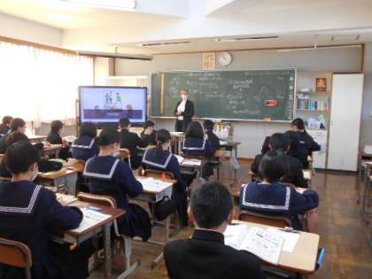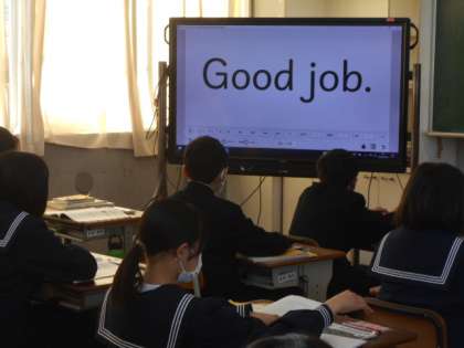今日もオールイングリッシュの授業です。There is〜,There are〜 を使った表現を学習していました。また、新しく学習する単語や語句を、フラッシュカードで画面に映しながら声を出して学んでいました。