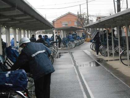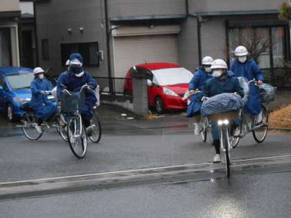 雨具を着ての登校です。手も悴むような、雪交じりの冷たい雨が降っていました。
