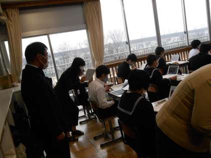 公立中学校として全国初となるDMM授業を推進している守谷中学校の取材に、今日は市教育委員会とDMMの関係者が来校しました。