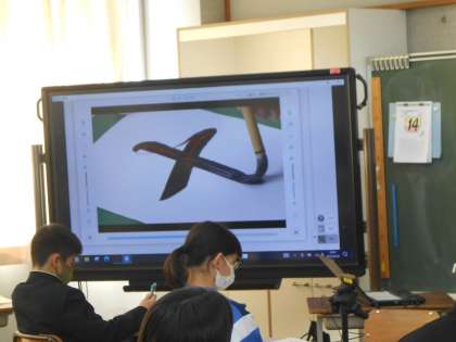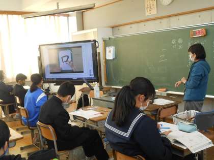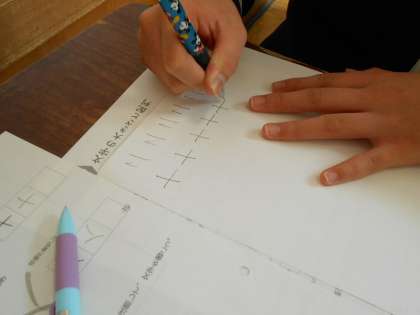 例えば「口」という漢字は3画です。でも行書では2画で書きます。楷書との筆の運びや文字の形の違いなど、動画を観ながらプリントで行書の練習を行っていました。