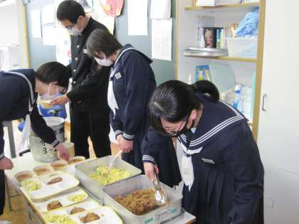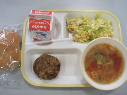 3月8日の給食は「丸パン、牛乳、ハンバーグ玉葱ソース、ミモザサラダ、トマト入りABCスープ」です。ミモザは「春を告げる花」ともいわれるそうです。3年生の卒業も目前ですね。