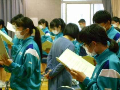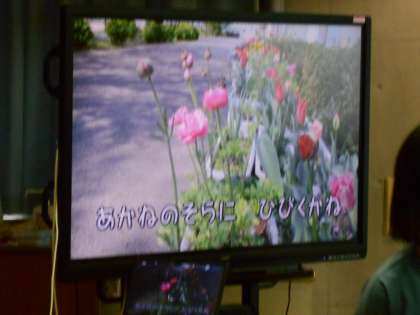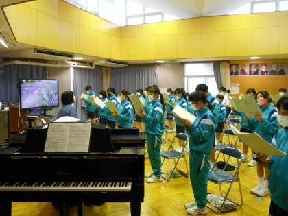 音楽室から聞こえる1年生の歌声。「若草萌ゆる 学びやに〜」と,守谷中校歌です。電子黒板に映し出された学校の画像と歌詞を見ながら,覚えていました。
