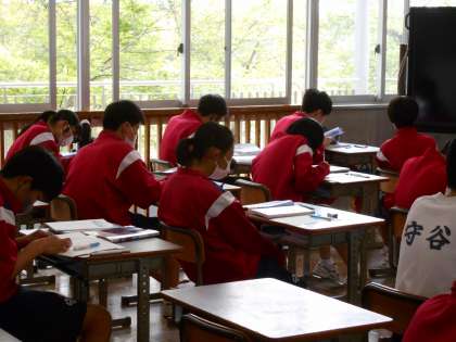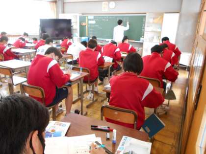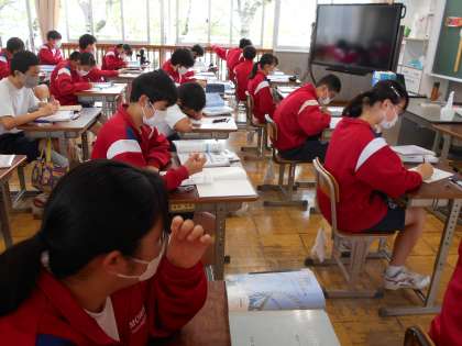 3年の理科の授業は,運動とエネルギーについて。力の表し方について野説明を真剣に聞いていました。
