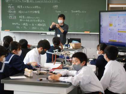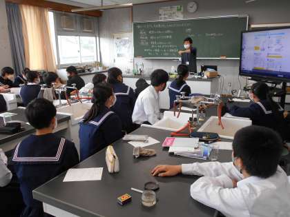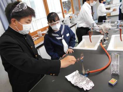 2年生の理科の授業は実験。金属の燃焼の様子を実験で確認していました。