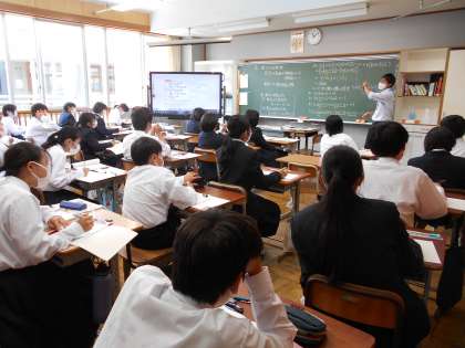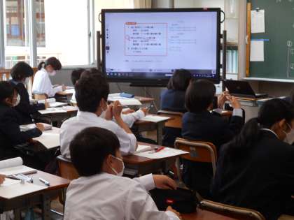 1年生の数学の授業は,正負の数の乗法について。いくつかの問題の解法を皆で共有していました。