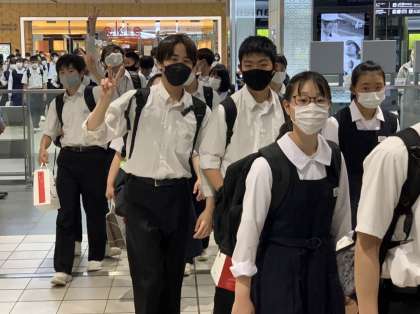 広島駅新幹線ホームに向かいます。皆笑顔です。