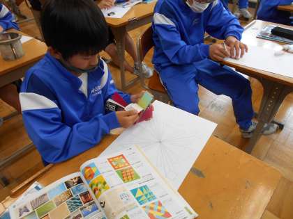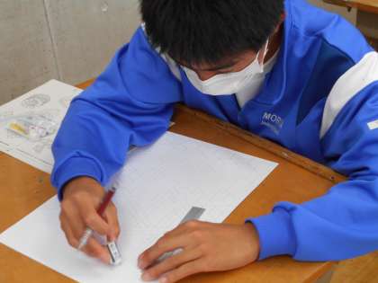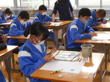 2年生の美術の授業。「空想の世界を創ろう」をテーマに,いろいろな図法を用いて描いていました。