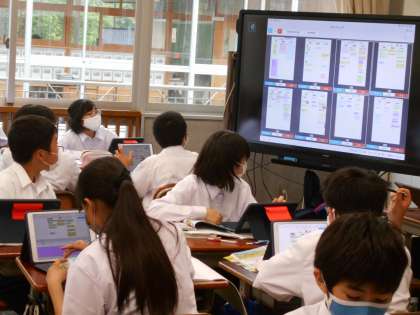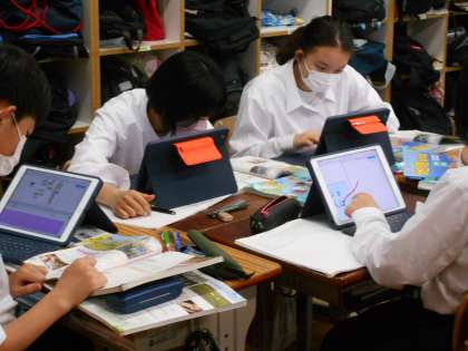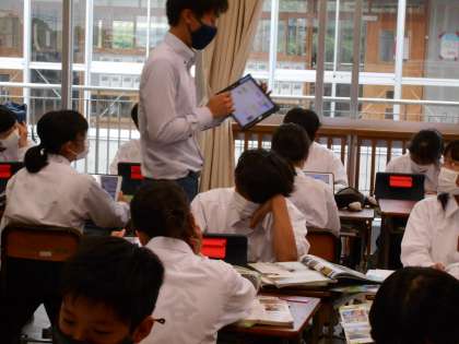 1年生の社会の授業は、日本とイタリアの生活について。同じ温帯の両国の相違点について各班で調べていました。