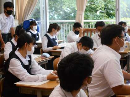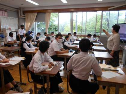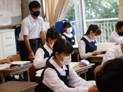 3年生の英語の授業は会話文について。質問の仕方を代表生徒が話していました。皆活発に取り組んでいました。