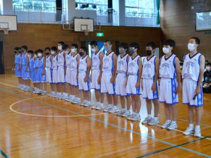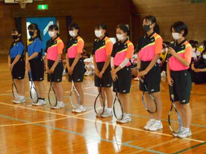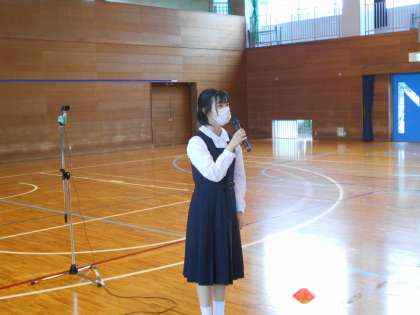男子バスケットボール部と女子ソフトテニス部の意気込み発表の様子です。