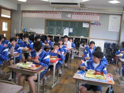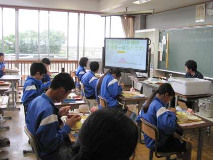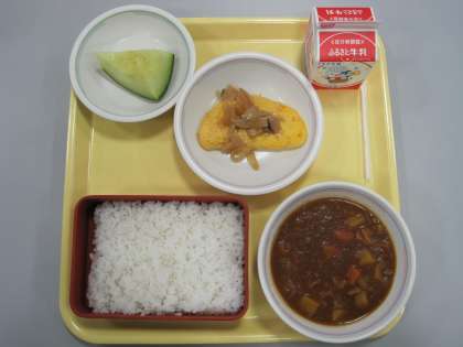 6月7日の給食は「ごはん、牛乳、チキンカレー、オムレツ、メロン」です。茨城県産のメロンを八百屋さんから入れてもらい、給食センターでカットしました。甘くみずみずしいメロンのよさを伝えるため、教室では動画を放送しました。