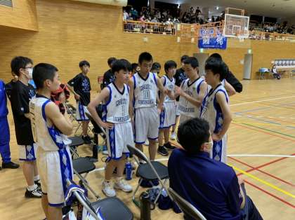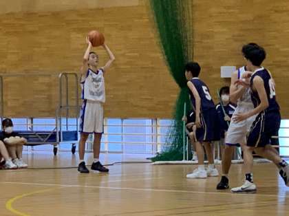 白熱した御所ケ丘中戦。開始直後、リードを奪い、一時は同点にされたものの、再びリードを広げて前半終了。頑張れ男子バスケットボール部。