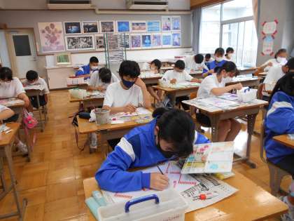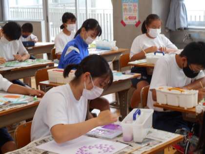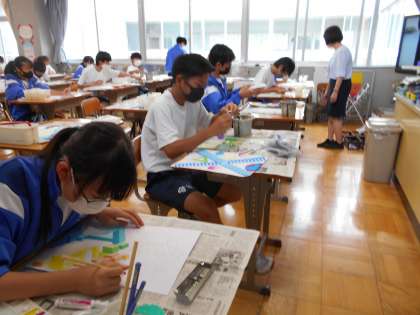 2年生の美術の制作テーマは、「空想の世界」。さまざまな技法を使って表現していました。