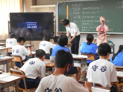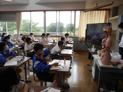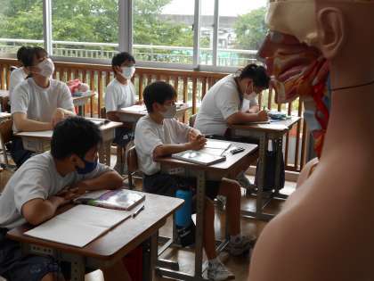 2年生の理科の授業は、人のからだについて。模型と映像で確認していました。