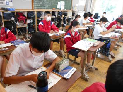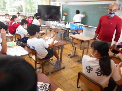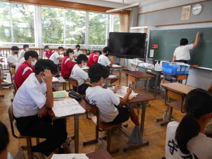 3年生の英語の授業は新しい単元。先生の話を集中して聞いていました。
