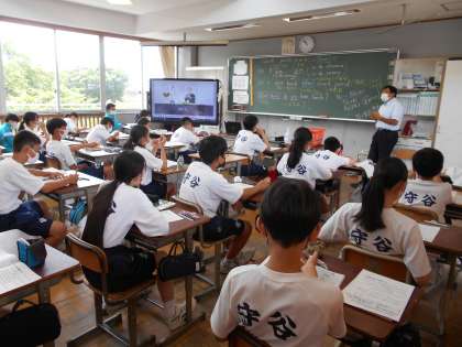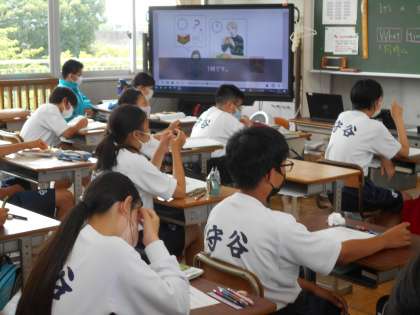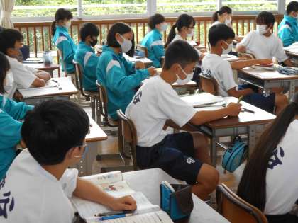 1年生の英語の授業。夏休みの課題についての説明を真剣に聞いていました。