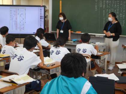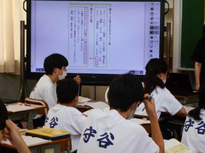 1年生の国語の授業は、説明文について。レポートのテーマ設定についての説明を真剣に聞いていました。