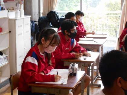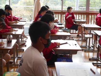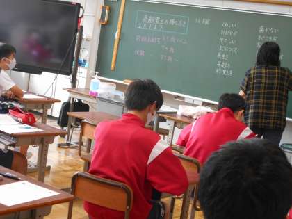 3年生の家庭科の授業は、高齢者との接し方について。皆体験談を発表していました。