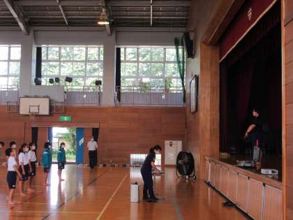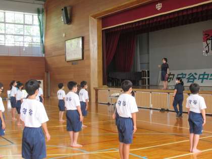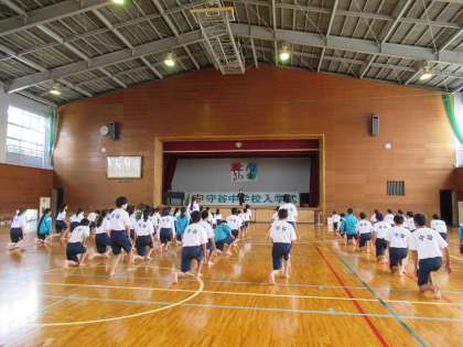 今月の体育は武道(空手)に挑戦します。今日は、オリエンテーションの後、基本の姿勢について学びました。皆、キリッと引き締まった表情で取り組んでいました。