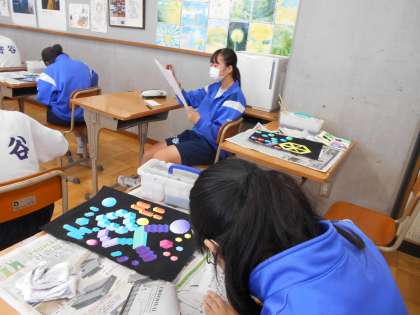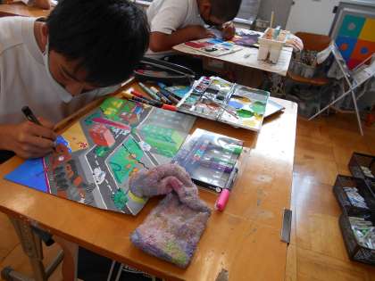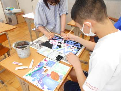 2年生の美術の授業は、「空想の世界」。さまざまな技法を使って空想の世界を表現していました。