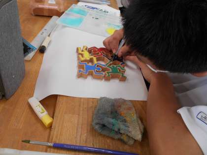 2年生の技術の授業。ライト製作で、装飾の仕上げをしていました。