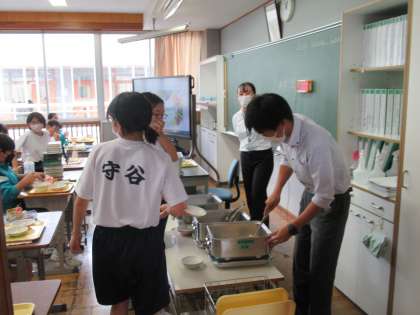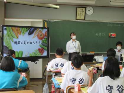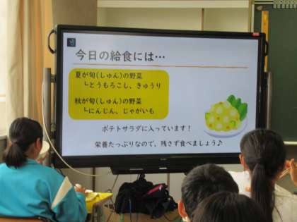 今日の給食に使われた食材について、教育実習生からお話がありました。今日の副菜は、夏と秋の旬の野菜をふんだんに使ったポテトサラダ。お話を聞いて、いつも以上においしさと栄養を実感できる給食のひとときとなりました。