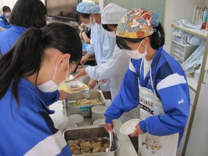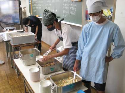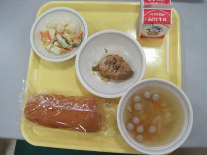 9月7日の給食は「ミルクパン、牛乳、鶏肉のマスタードソース焼き、ポテトサラダ、コンソメスープ」です。鶏肉はオーブンで焼き、粒マスタードをベースにしたソースをかけました。