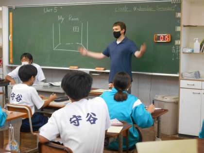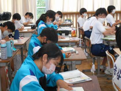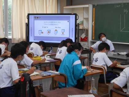 1年生の英語の授業の様子。ものの位置関係を英語で表す場合について、確認していました。