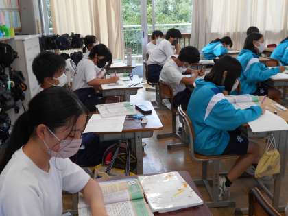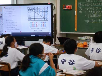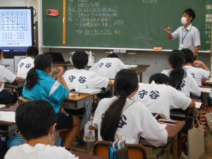 1年生の数学の授業は、1次方程式。部活動の試合数と試合時間を例にして進めていました。
