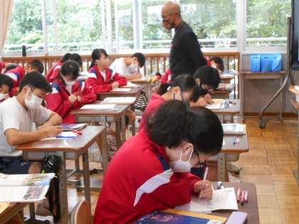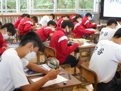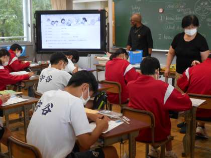 3年生の英語の授業の様子。問題文を電子黒板に映し,皆で取り組んでいました。