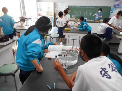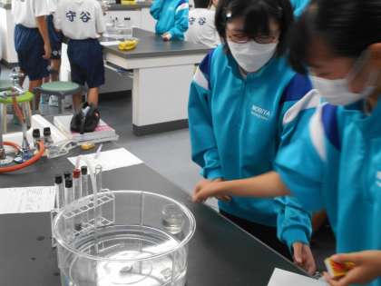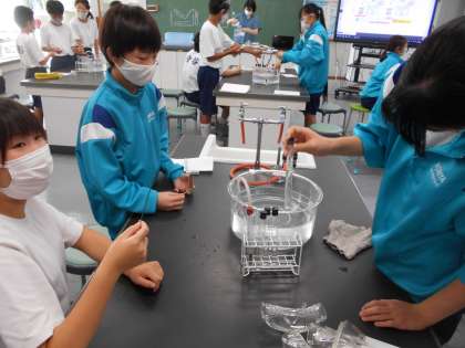 1年生の理科の授業は、気体について。酸素と二酸化炭素を発生させ、水上置換法で集めて性質を調べていました。