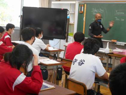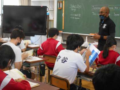 3年生の英語の授業の様子。タイ先生からの教科書本文に関する質問を、真剣に考えていました。
