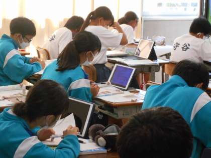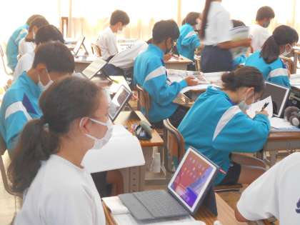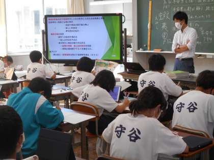 1年生の社会の授業は平安京について。先生の説明を真剣に聞いていました。