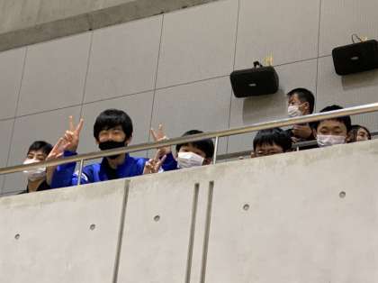 女子団体戦。守中はシードで、間も無く試合です。個人戦の男子は、応援の体制を整えていました。