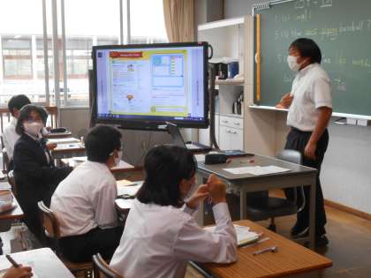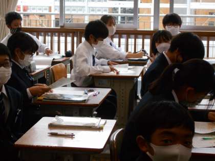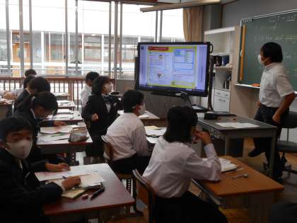 1年生の英語の授業は、単元末テストの確認。先生の話を集中して聞いていました。